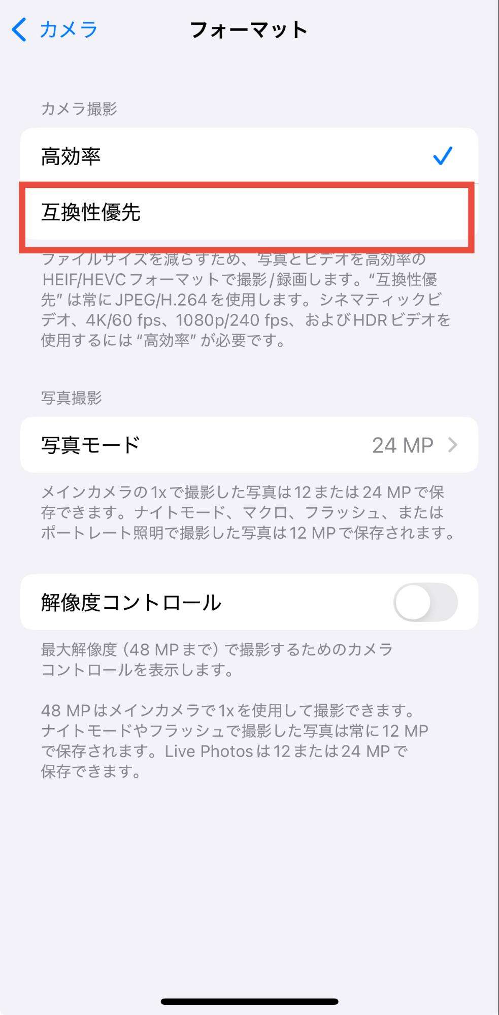 - 通常は高効率(HEIC)が選択されているので、互換性優先を選択します。